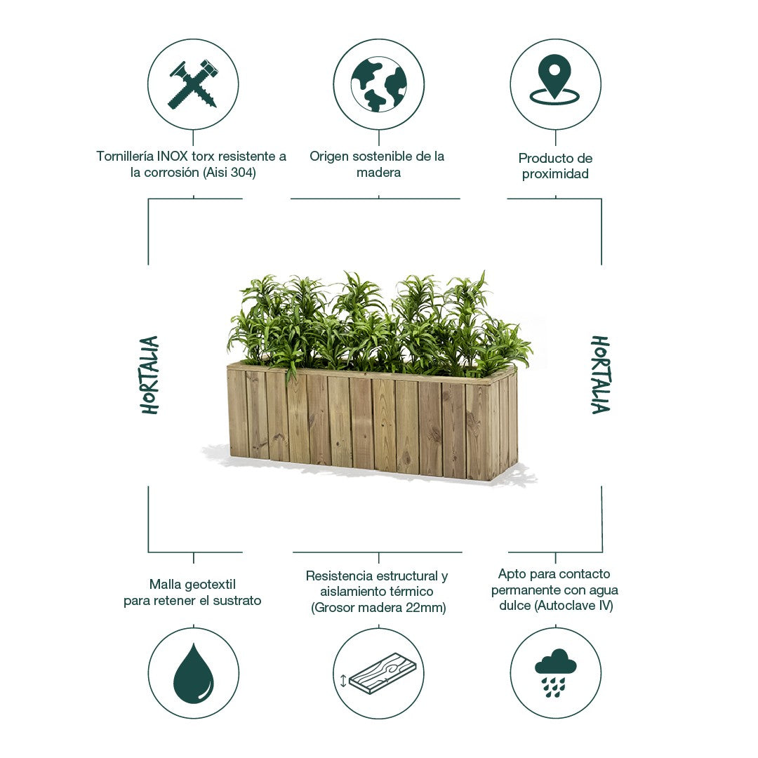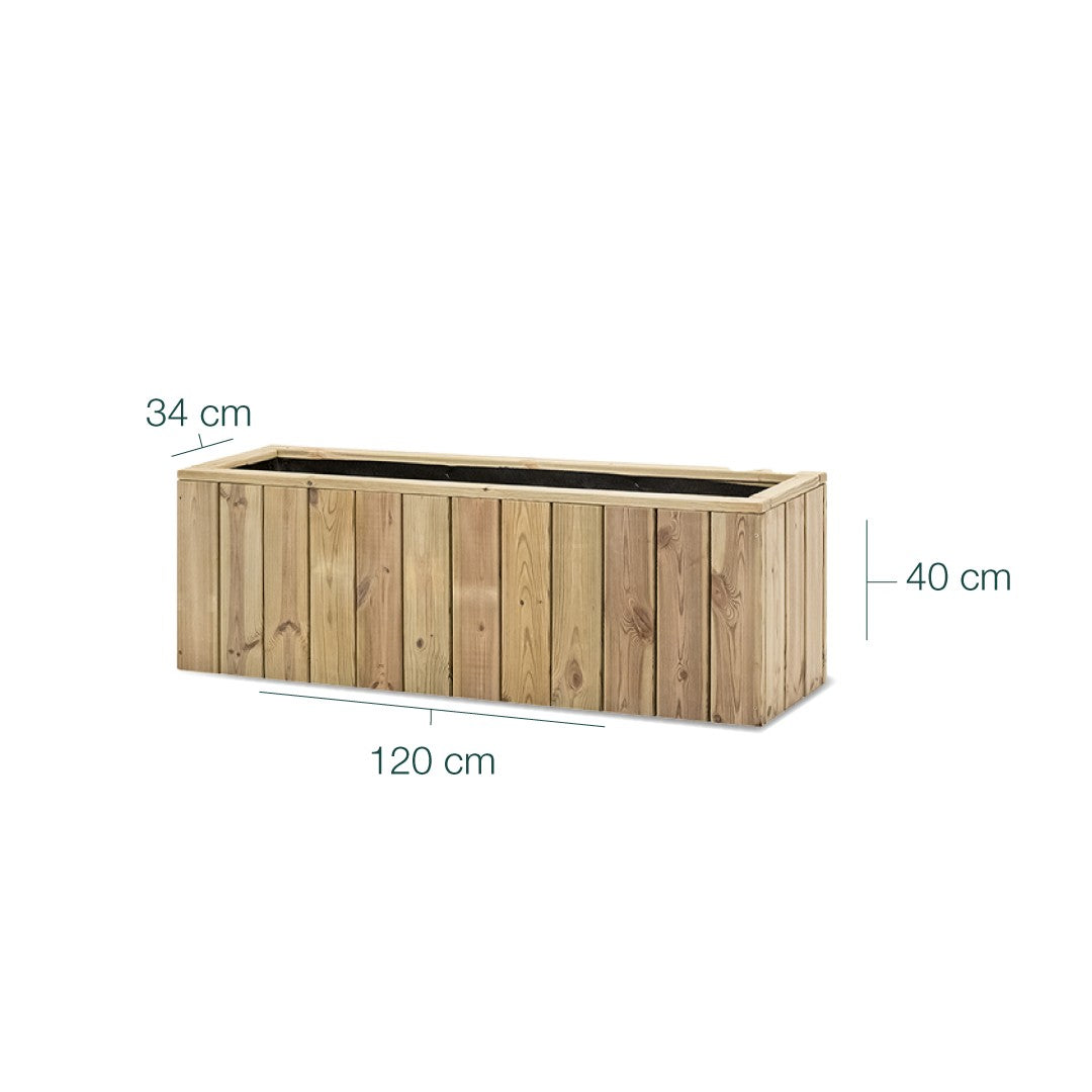 Jardinera de madera 120×34.5×40 de lamas verticales con un acabado liso y un marco embellecedor con cantos redondeados.