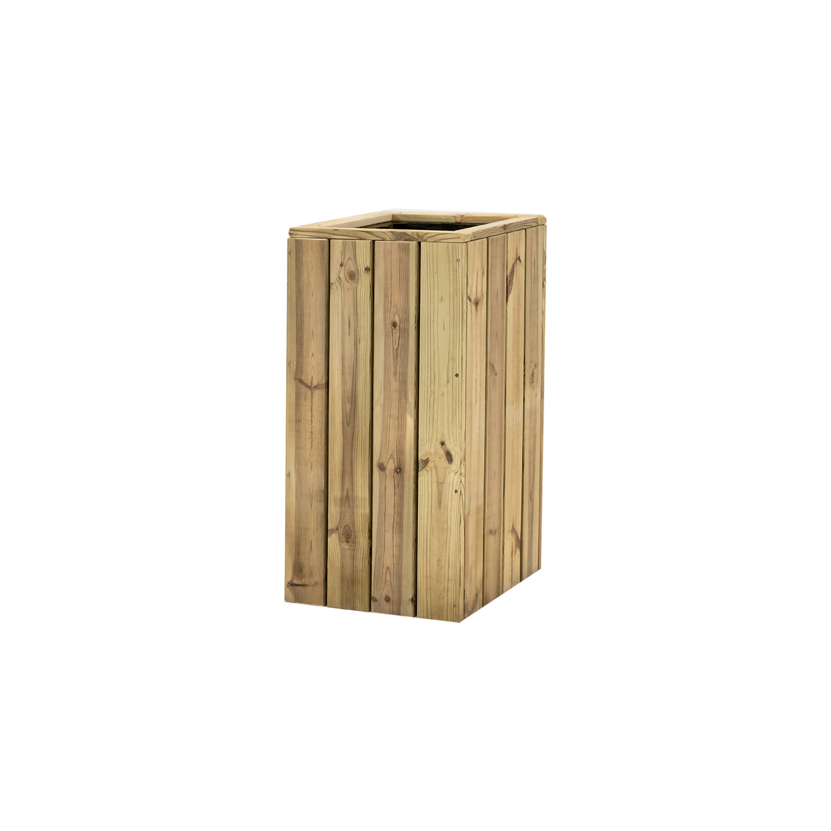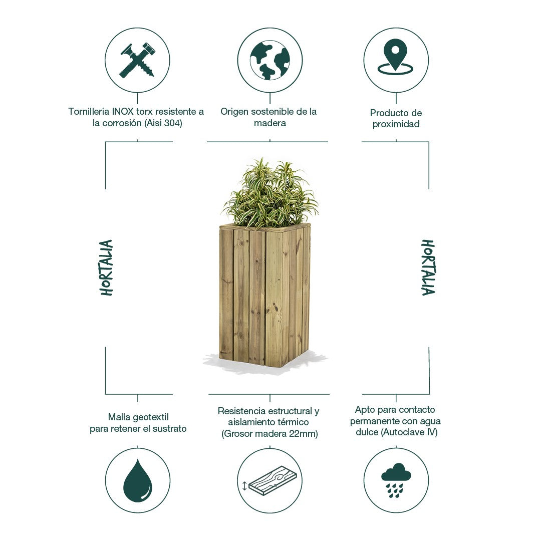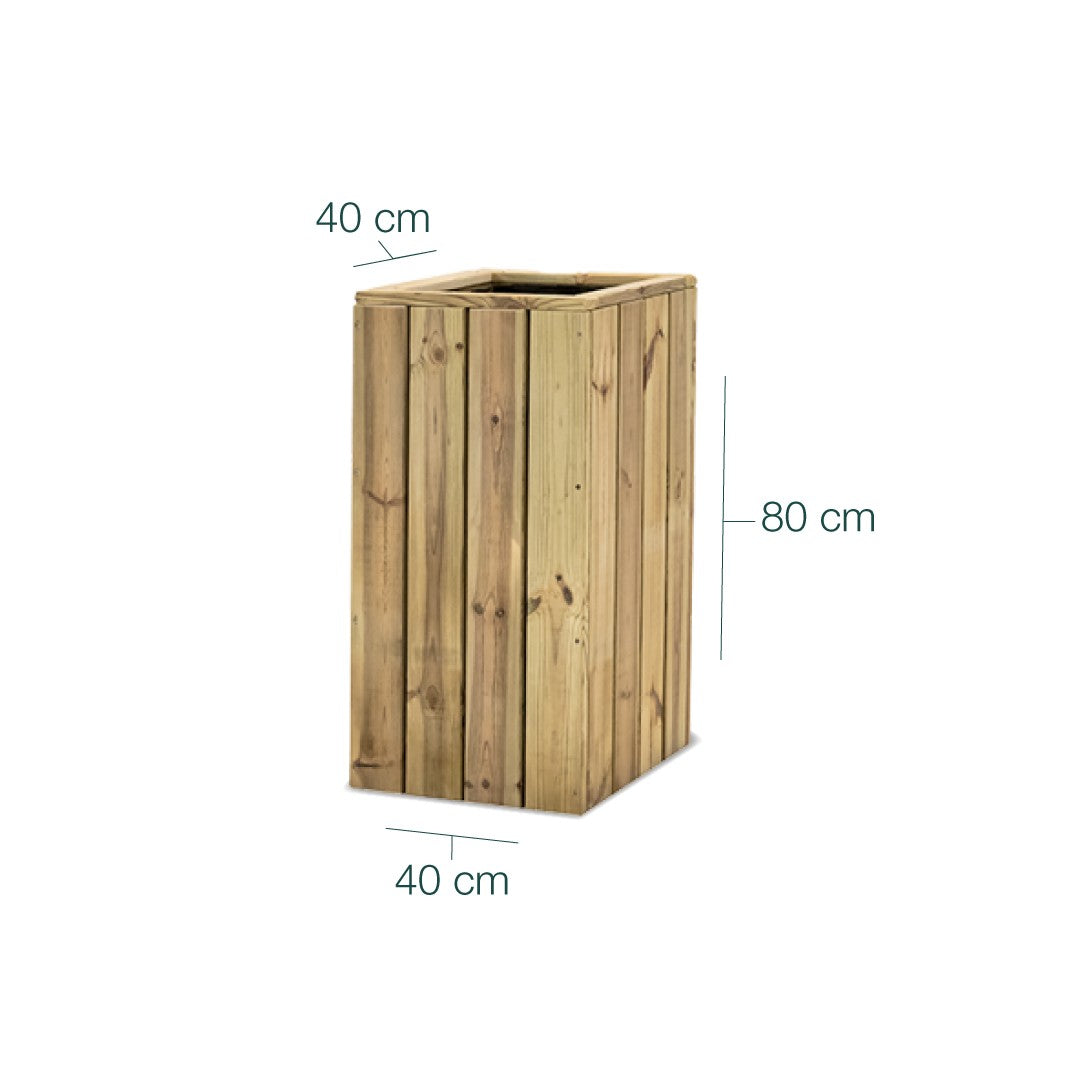 Jardinera de madera 40x40x80 de lamas verticales con un acabado liso y un marco embellecedor con cantos redondeados.