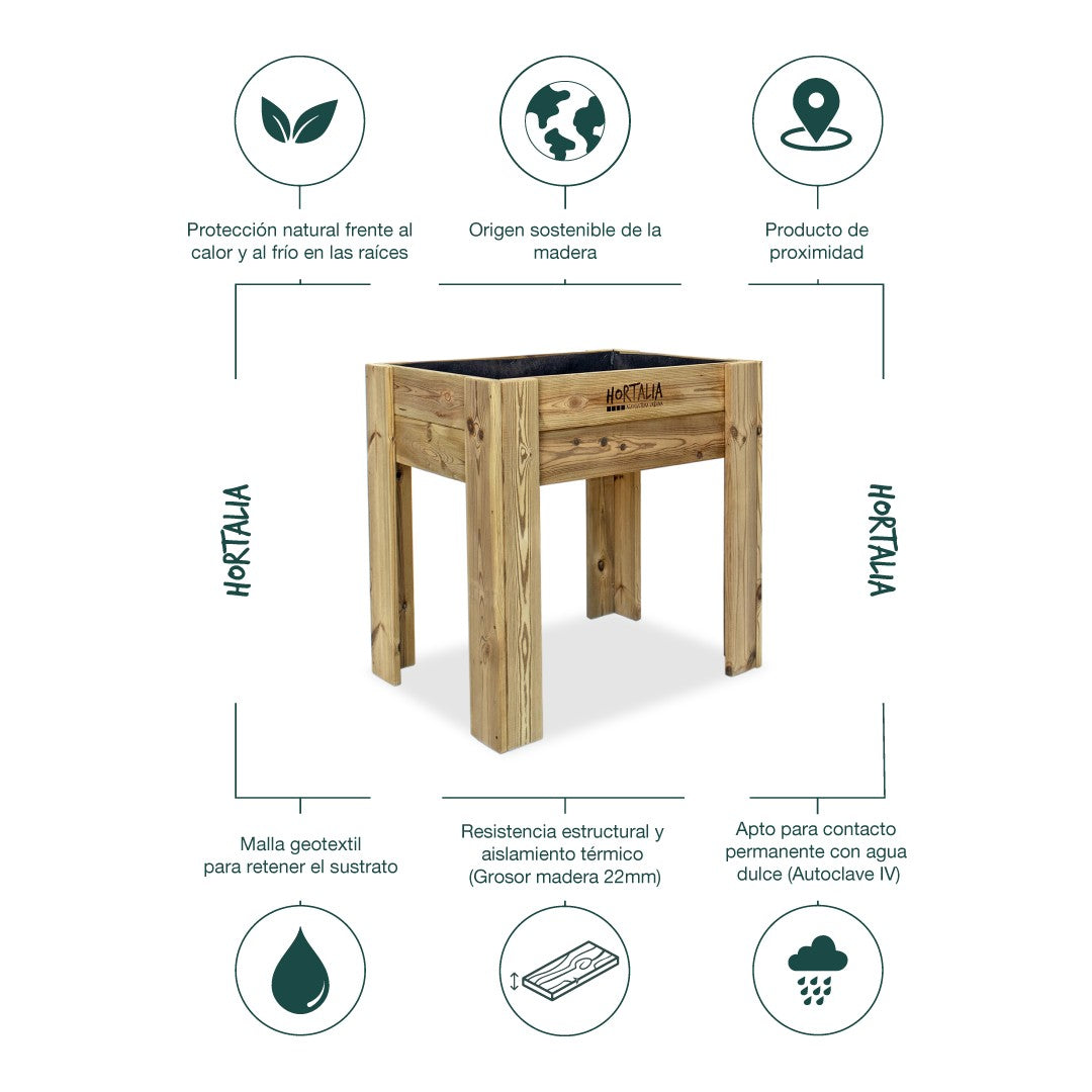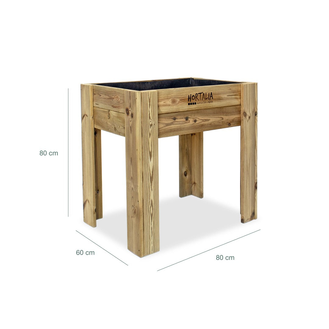 Mesa de cultivo de madera tratada 80x60x80 para exteriores donde poder crear tu espacio verde y cultivar tus alimentos.