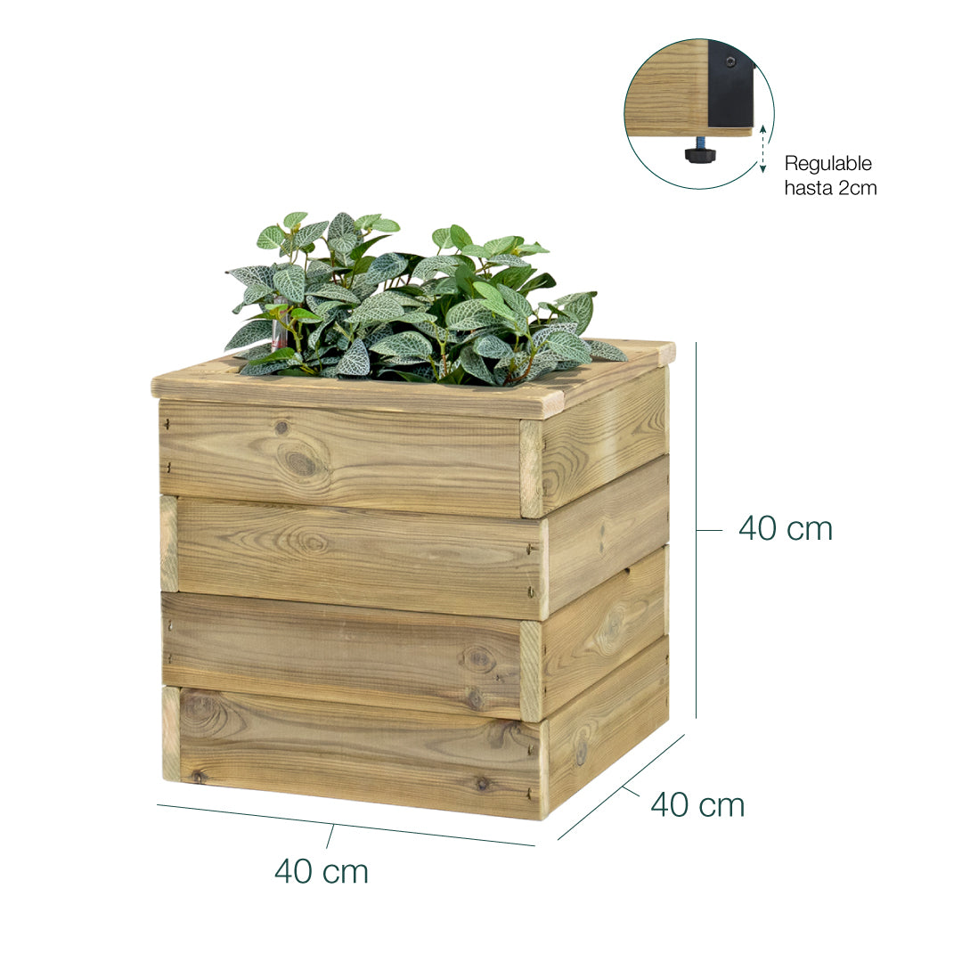 Jardinera de madera tratada 40x40x40 cm con sistema de autorriego integrado diseñada para uso interior y exterior.