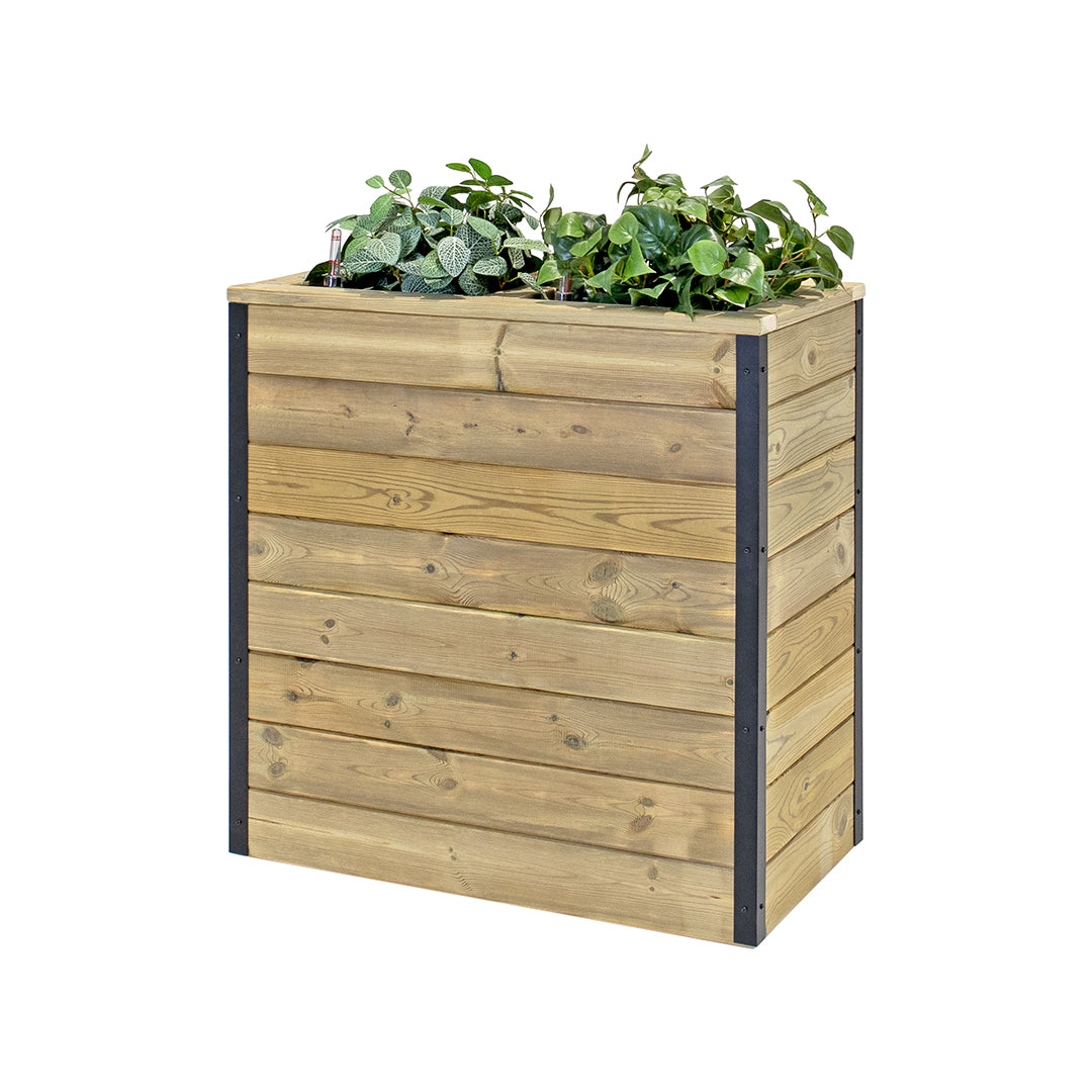Jardinera de madera tratada 75x40x80 cm con sistema de autorriego integrado diseñada para uso interior y exterior.